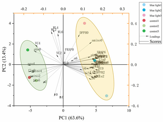 Multivariate principal component analysis showing pre-harvest supplemental blue light enhanced quality of the flower stalk in Chinese kale during post-harvest storage: a, chlorophyll a; b, chlorophyll b; t, total chlorophyll; c, carotenoids; WL, weight loss; phe, total phenolic content; fla, flavonoids; VC, Vitamin C; pro, soluble protein; amino, free amino acids; DPPH, DPPH radical inhibition percentage; FRAP, ferric ion reducing antioxidant power. 0 = 0 DAH, 2 = 2 DAH, 4 = 4 DAH, and 6 = 6 DAH.