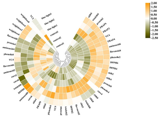 Cluster heatmap analysis summarizing the quality in flower stalk of Chinese kale in supplemental blue light and control treatment. Results are visualized using a false color scale with yellow as an increased parameter while green as a decreased parameter. chla, chlorophyll a; chlb, chlorophyll b; totalchl, total chlorophyll; caro, carotenoids; phenolic, total phenolic; flavonoid, total flavonoids; VC, Vitamin C; protein, soluble protein; aminoacid, free amino acids; DPPH, DPPH radical inhibition percentage; FRAP, ferric ion reducing antioxidant power. 0 = 0 DAH, 2 = 2 DAH, 4 = 4 DAH, and 6 = 6 DAH. The color scale from green to orange indicates the quality in the flower stalk of Chinese kale from low to high.