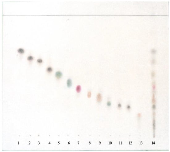 TLC of lipophilic compounds from Psephellus bellus. Adsorbent: silica gel. Mobile phase: n-hexane–CH2Cl2–AcOEt 4:2:5. 1. cebellin L, 2. cebellin O, 3. cebellin K, 4. cebellin N, 5. 19-deoxychlorojanerin, 6. 17,18-epoxy-19-deoxychlorojanerin, 7. cebellin M, 8. 8-desacylo-8α-(2′-methyl-acryloxy)-subluteolide, 9. repin, 10. centaurepensin, 11. cebellin A, 12. cebellin B, 13. acroptilin, and 14. extract from Psephellus bellus herb.