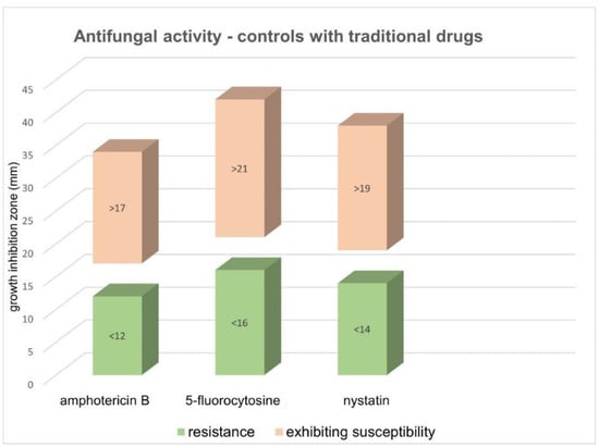 No inhibition zone was observed in the negative controls. The results (diameter of growth inhibition zone) of controls with traditional drugs (C. albicans) were as follows (Figure 3): (i) amphotericin B, exhibiting susceptibility >17 mm, resistance <12 mm; (ii) 5-fluorocytosine, exhibiting susceptibility >21 mm, resistance <16 mm; and (iii) nystatin, exhibiting susceptibility >19 mm, resistance <14 mm.
