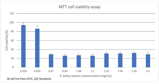 The MTT cell viability assay on a human skin fibroblast cell line. The results are expressed as cell viability with different P. bellus extract concentrations. Values are given as mean + standard error.