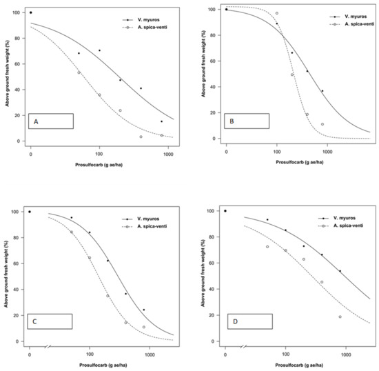 Prosulfocarb dose–response on aboveground fresh weight represented as percentage of untreated control of Vulpia myuros and Apera spica-venti in Experiment 2 at: BBCH 00 (A); BBCH 10 (B); BBCH 11 (C); and BBCH 12 (D).