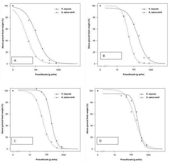 Prosulfocarb dose–response on aboveground fresh weight represented as percentage of untreated control of Vulpia myuros and Apera spica-venti in Experiment 1 at: BBCH 00 (A); BBCH 11 (B); BBCH 12 (C); and BBCH 13 (D).
