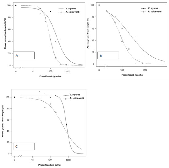 Prosulfocarb dose–response on aboveground fresh weight represented as percentage of untreated control of Vulpia myuros and Apera spica-venti in Experiment 3 at: BBCH 00 (A); BBCH 10 (B); and BBCH 13 (C).