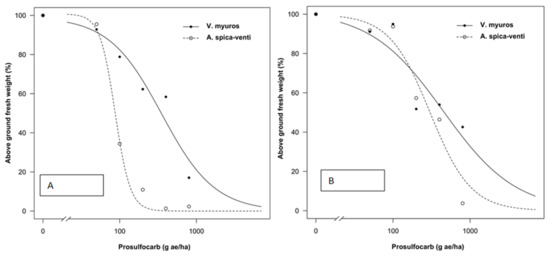 Prosulfocarb dose–response on aboveground fresh weight represented as percentage of untreated control of Vulpia myuros and Apera spica-venti Experiment 4 at: BBCH 11 (A); and BBCH 12 (B).