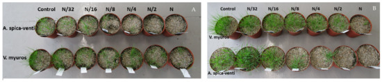Photographic illustration of prosulfocarb dose–response for the Vulpia myuros and Apera spica-venti sprayed on: pre-emergent seeds (A); and germinating seedlings (B). The normal dose (N) of prosulfocarb was 800 g/ha.