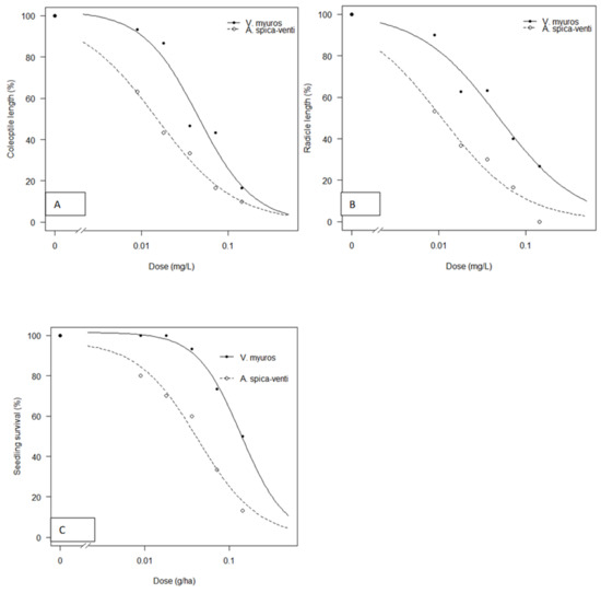 Dose–response of mesosulfuron-methyl + iodosulfuron-methyl on germination and coleoptile (A) and radicle lengths (B) and seedling survival (C) of V. myuros and A. spica-venti in agar-based bioassay.