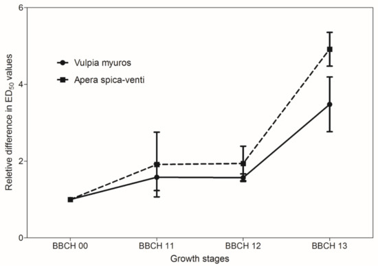 The relationship between relative difference in ED50 values with the increased growth stages and BBCH growth stages in V. myuros and A. spica-venti. The ED50 values with the increased growth stages were pooled across Experiments 1–3. Vertical bars represent standard errors of the mean.