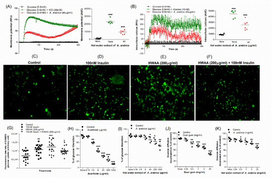 Effects of hot-water extract of A. arabica bark on (A) membrane potential and (B) intracellular calcium in BRIN BD11 cells, (C–G) glucose uptake in differentiated 3T3L1 adipocyte cells, (H) acarbose, (I) starch digestion, (J) guar gum and (K) glucose diffusion in vitro. Changes in fluorescence intensity in differentiated 3T3L1 adipocytes incubated with extract in the (E) absence or (F) presence of 100 nM insulin. Images were taken at 10× magnification. Values are the mean ± SEM for n = 6 for membrane potential and intracellular calcium and n = 4 (~20 values of fluorescence intensity per group for glucose uptake) for glucose uptake, starch digestion and glucose diffusion. * p < 0.05, ** p < 0.01 and *** p < 0.001 compared to control.