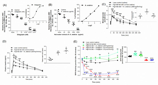 The DPP-IV enzyme inhibitory actions of A. arabica were estimated following an earlier report [43]. The chemical reagents, including 8 mU/mL of DPP-IV enzyme and 200 μM of substrate (Gly-Pro-AMC), were incubated with treatment groups in 96-well plates and processed as per a previous description [41]. Visual changes in the fluorescence were analysed by excitation at 370 nm and emission at 440 nm with a 2.5 nm slit width by FlexStation 3 (Molecular Devices, Sunnyvale, CA, USA).