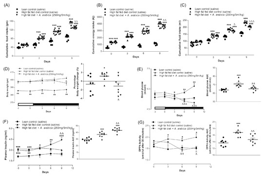 Effects of 9-day, twice-daily oral administration of hot-water extract of A. arabica bark on (A) food intake, (B) energy intake, (C) fluid intake, (D) body weight, (E) blood glucose, (F) plasma insulin and (G) DPP-IV enzyme activity in high-fat-fed rats. Parameters were measured prior to and after oral administration of A. arabica bark (250 mg/5 mL/kg, body weight) twice daily. Values are the mean ± SEM for n = 8 rats. * p < 0.05, ** p < 0.01 and *** p < 0.001 compared to lean control. Δ p < 0.05, ΔΔ p < 0.01 and ΔΔΔ p < 0.001 compared to high-fat-fed control at corresponding time points.
