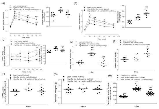 Chronic effects of twice-daily oral administration of hot-water extract of A. arabica bark on (A) glucose tolerance, (B) plasma insulin and (C) plasma DPP-IV on Day 6 and (D) blood glucose, (E) plasma insulin, (F) plasma DPP-IV, (G) pancreas weight and (H) pancreatic insulin content on Day 9 in high-fat-fed rats. Parameters were measured after treatment for 6 or 9 days with twice-daily oral administration of hot-water extract of A. arabica bark (250 mg/5 mL/kg body weight). Values are the mean ± SEM with n = 8 (~32 per group for pancreatic insulin content). * p < 0.05, ** p < 0.01 and *** p < 0.001 compared to lean control. Δ p < 0.05, ΔΔ p < 0.01 and ΔΔΔ p < 0.001 compared to high-fat-fed control at corresponding time points.