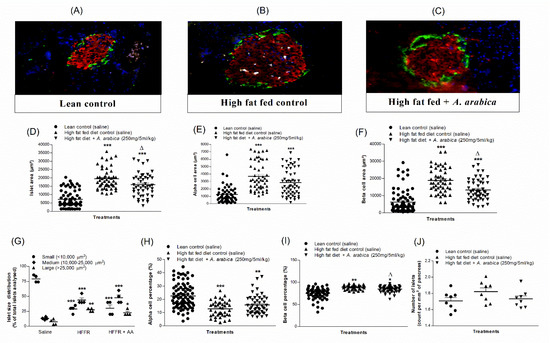 Effects of 9-day twice-daily oral administration of hot-water extract of A. arabica bark on islet morphology in high-fat-fed rats. Representative images of (A) lean control, (B) high-fat-fed control and (C) high-fat-fed plus hot-water extract of A. arabica (250 mg/5 mL/kg) in rats showing insulin in red, glucagon in green and DAPI in blue, (D) islet area, (E) alpha-cell area, (F) beta-cell area, (G) islet size distribution, (H) alpha-cell percentage, (I) beta-cell percentage and (J) number of islets (per mm2), respectively. Values are the mean ± SEM for n = 8 (~50 islets per group). * p < 0.05, ** p < 0.01 and *** p < 0.001 compared to lean control. Δ p < 0.05 compared to high fat fed alone (control).
