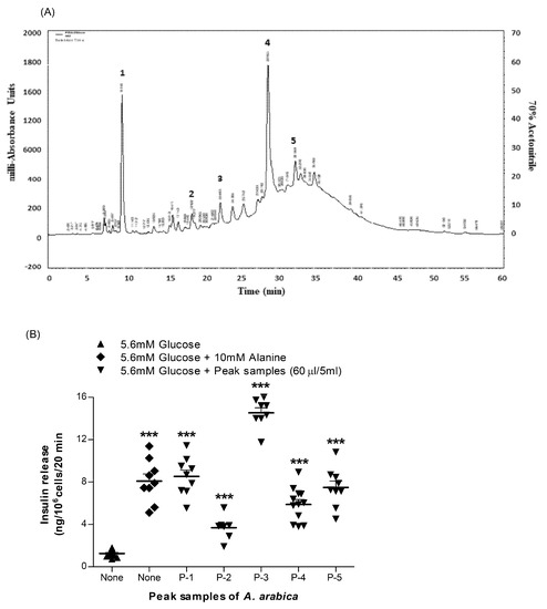 The five major and clearly defined peak fractions of A. arabica bark extract from RP-HPLC (Figure 7A) were assayed for insulin-secretory activity using BRIN-BD11 cells as described above. As shown in Figure 7B, all five peak fractions (P-1, P-2, P-3, P-4 and P-5) significantly stimulated insulin release (p < 0.001), as did the 10 mM alanine-positive control. Only P-3 was associated with cytotoxicity, as evidenced by the 2.1-fold increase in cellular LDH release (Figure S1C).