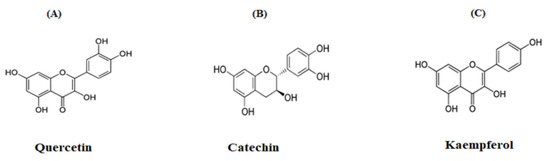 The bark of A. arabica was collected from Jahangirnagar University, Dhaka, Bangladesh, and Botanical Accession Number 43,756 was assigned by the National Herbarium. Barks were processed for hot-water extraction, as described previously [48]. The final extracted semisolid, sticky residue of A. arabica bark was freeze-dried using a freeze dryer (Varian 801 LY-3-TT, Varian, Lexington, MA, USA) and stored at 4 °C until use. Flavonoids, including quercetin, catechin and kaempferol, were obtained from Sigma-Aldrich (Poole, UK).