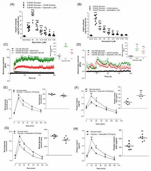 Insulin-releasing effects of (A) Quercetin and (B) Kaempferol, (C) membrane potential and (D) intracellular calcium from BRIN-BD11 cells, (E,G) glucose tolerance and (F,H) plasma insulin. Mice were fasted for 12 h and administered glucose (18 mmol/kg body weight) by oral gavage with or without (E,F) simultaneous quercetin (100 mg/kg b.w.) and (G,H) kaempferol (70 mg/kg b.w.). Values are the mean ± SEM for n = 8 for insulin release, n = 6 for membrane potential, intracellular calcium, glucose tolerance and plasma insulin. * p < 0.05, ** p < 0.01 and *** p < 0.001 compared to control.
