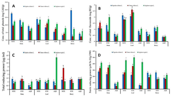 Variation in total phenolic contents (A), total flavonoid content (B), total reducing power (C), ferric reducing power antioxidant and (D) assays in Viscum album L. influenced by different hosts. Values are the mean ± SD of three replications. Sets of bars with different letters are significantly different (p < 0.05). MTE (methanolic extract), ETE (ethanolic extract), and AQE = (aqueous extract).