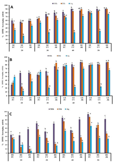 % DPPH scavenging potential of Viscum album L. stem (A), leaf (B), and berry (C) extracts at different concentrations (20 µL, 30 µL, 40 µL, and 50 µL) influenced by different hosts. Values are the mean ± SD of three replications. Bars with different letters are significantly different (p < 0.05). PC = Populus ciliata L., UV = Ulmus villosa L., JR = Juglans regia L.; SE= stem extract, LE = leaf extract, BE = berry extract.