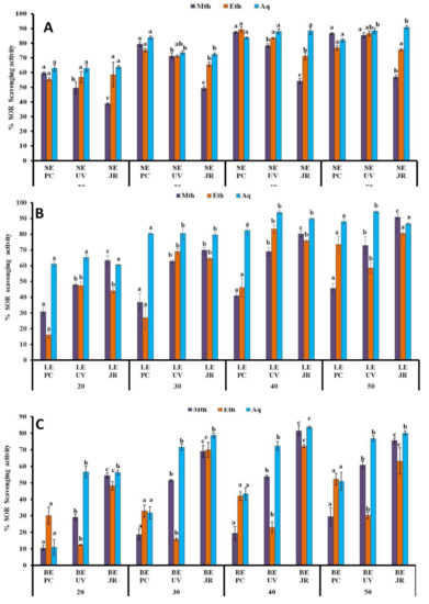 % SOR scavenging potential of Viscum album L. stem (A), leaf (B), and berry (C) extracts at different concentrations (20 µL, 30 µL, 40 µL, and 50 µL) influenced by different hosts. Values are the mean ± SD of three replications. Bars with different letters are significantly different (p < 0.05). PC = Populus ciliata L., UV = Ulmus villosa L., JR = Juglans regia L.; SE = stem extract, LE = leaf extract, BE = berry extract.
