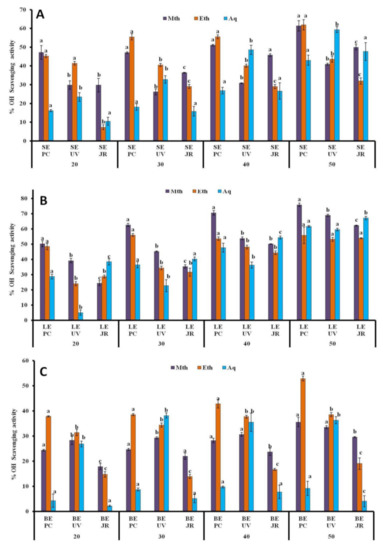 % OH scavenging activity of Viscum album L. stem (A), leaf (B), and berry (C) extracts at different concentrations (20 µL, 30 µL, 40 µL, and 50 µL) influenced by different hosts. Values are the mean ± SD of three replications. Bars with different letters are significantly different (p < 0.05). PC = Populus ciliata L., UV = Ulmus villosa L., JR = Juglans regia L.; SE = stem extract, LE = leaf extract, BE = berry extract.