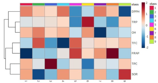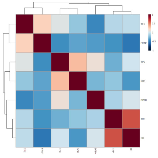 Pearson’s correlation coefficient was used for quantifying relationships between various parts of the epiphytic plant Viscum album L. and its different hosts. Figure 6 shows the Pearson correlations and levels of significance for the relationship between the total phenolic content (TPC), total flavonoid content (TFC), and antioxidant (FRAP, DPPH, SOR, OH) activities between the host trees and the various parts of the epiphytes. The results of the different antioxidant assays used in the present investigation of different parts of the Viscum album L. extracts were compared and correlated with each other. Correlation between the results of different antioxidant assays is presented in Figure 7. The total phenolic content (TPC) showed a good correlation with most of the antioxidant assays, such as FRAP (R2 = −0.520*), SOR (R2 = −0.192), and DPPH radical scavenging assay (R2 = −0.448) (Table 2). Similarly, the total reducing power (TRP) exhibited a moderate correlation with hydroxyl radical (OH) scavenging activity. Further, the total flavonoid content (TFC) showed a correlation with DPPH radical scavenging activity (R2 = −0.448). Considering all Viscum-host pairs, there were several remarkable differences. There were clear tendencies for Viscum album L. and its hosts to differ in total phenols, with Viscum album L. showing a higher polyphenol content among the five pairs. A a strong correlation for the total reducing power (TRP) and hydroxyl radical (OH) scavenging activity was found between the Viscum album L. leaf and its host Juglans regia L. followed by Viscum album L. berry and its host Ulmus villosa for total reducing power (TRP) (R2 = 0.636**), while least significant correlations were detected for the other pairs.