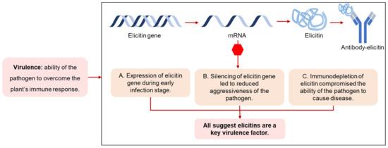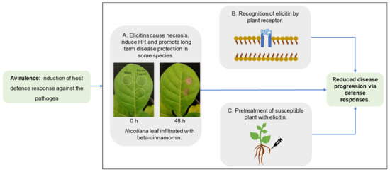 As a result of the studies carried out to date, it has been established that elicitins may have opposing functions in plant–pathogen interactions: on the one hand, through the promotion of virulence via enabling the pathogen to cause disease (Figure 2) or on the other, avirulence, by the induction of plant defense responses (Figure 3). The contradictory role of these proteins in terms of pathogenicity is clear; for example, transcriptomic data has shown elicitin genes of Phytophthora phaseoli to be differentially upregulated in lima beans (Phaseolus spp.) during the infection stage, supporting a virulence role [25], whereas the induction of HR in N. benthamiana by elicitins that contain pathogen spread supports a role in avirulence [26].