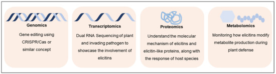 The four omics platforms that can be adapted to solve the underlying uncertainties around elicitin functions and to further understand their involvement in plant–pathogen interactions.