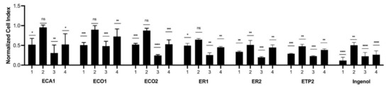 Figure 1). Ingenol mebutate administered at 5 µg/mL for 24 h exerted the strongest cytotoxic effect, and after a 48 h treatment, a lower cytotoxicity was measured. The treatment of keratinocytes with ingenol mebutate at a 0.5 µg/mL concentration resulted in a weaker, but still significant, cytotoxic effect after 24 h and, interestingly, after 48 h, the inhibitory activity was comparable to the treatment when 5 µg/mL was used for 48 h. The extracts with a 5 µg/mL concentration were applied for 24 h, and ET1 and ET2 had similar, but lower, cytotoxic activity than that of ingenol mebutate. Interestingly, the 48 h treatment of cells with 5 µg/mL extracts ECA1, ECO2, ER1, ER2, ET1, and ET2 showed a very similar cytotoxic property as ingenol mebutate. Cytotoxic activity was the lowest when the extracts were used at a 0.5 µg/mL concentration for 24 h, but in the case of ER2, ET1, and ET2, cytotoxic activity was significant compared to the control and quite similar to that of ingenol mebutate. After administration of the extracts at a 0.5 µg/mL concentration for 48 h, only ET1 displayed cytotoxicity comparable to that of ingenol mebutate. Based on these results, the