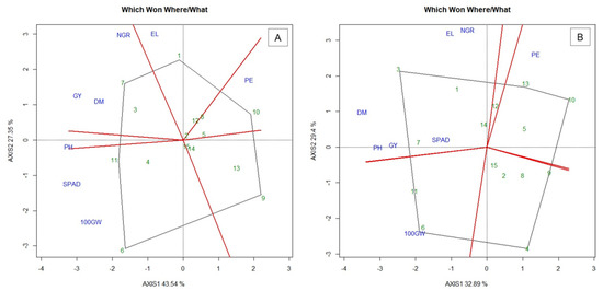 In the “which won where/what” graph of the biplot analysis in the WS, six distinct groups were formed with the studied traits (Figure 1A). According to Yan [17], in this graph, groups of traits are formed by traits between the perpendicular lines and these groups are used to identify the genotypes with the best prominence for these traits. Thus, the genotypes located at the vertices of the polygon are far from the center of origin of the graph, indicating their best performance for the group of characteristics [17,18,19]. In contrast, the genotypes within the polygon are those that are least responsive to the characteristics studied. The first group included only the trait ear length (EL). Similarly, the second group was formed only by popping expansion (PE), while the third group was formed by 100-grains weight (100GW) and SPAD. The fourth group was formed only by plant height (PH), while the fifth group was formed by grain yield (GY), dry matter (DM) and number of grains per row (NGR).