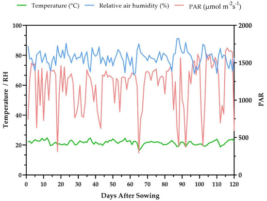An automatic station of the Brazilian Meteorological Institute (INMET) [63], located 100 m from the experiment, recorded the experimental conditions throughout the period of growth and development of the culture, with temperature variations being recorded (15.90–25.40 °C, average of 22 °C), relative humidity of the air (66.50–92.00%, average of 77%) and the average daily photosynthetically active radiation (PAR—1190 µmol m−2 s−1) (Figure 5).