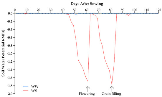 The water potential of the soil was monitored with Decagon MPS-6 tensiometers (Decagon, Pullman, WA, USA) installed between plants, at a depth of 0.20 m. The soil in WW conditions was maintained at field capacity (−0.01 MPa), while under WS, the soil reached the permanent wilt point (−1.5 MPa) twice—the first time during flowering (59 days after sowing) and the second during grain filling (81 days after sowing) (Figure 6).