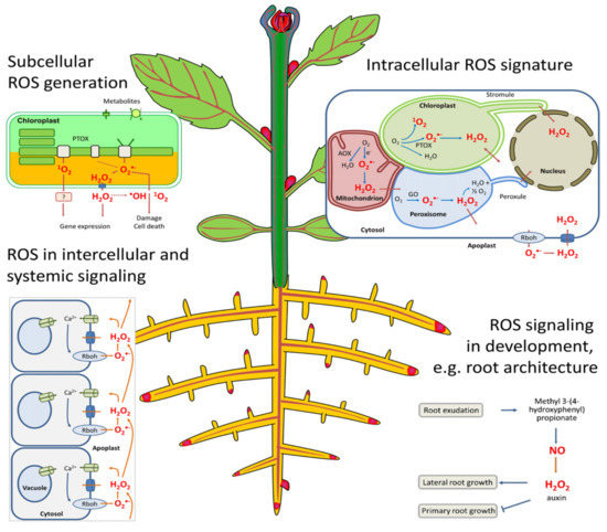 Roles of reactive oxygen species (ROS) involving multiple regulations in different cellular compartments of a plant [126].