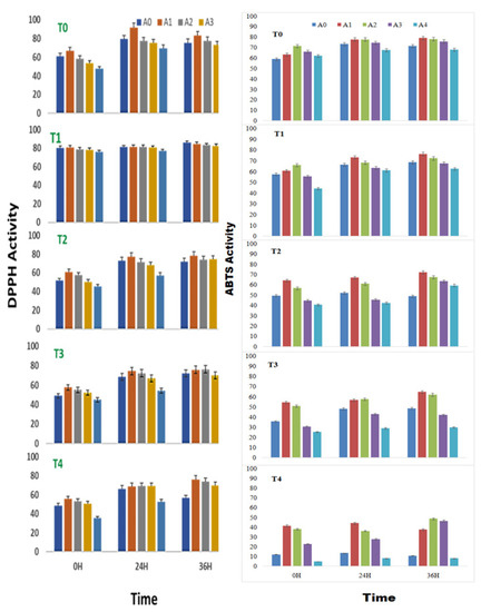 The DPPH radical-scavenging activity of sprouts of V. radiata was found to increase with time and peaked at 24 h of treatment in control and at 0.01% of ANE. The treatments, T2 T3 and T4 with ANE, were superior at 36 h of sprouting. In a stress-free environment, 0.01% ANE treatment positively influenced the DPPH radical-scavenging activity (91.8%) at 24 h of sprouting. At 0 h of treatment, the DPPH radical-scavenging activity was increased from 61.1 ± 0.3% to 67.1 ± 0.3% in the radical scavenging of sprouts when treated with 0.01% ANE. Similarly, at 24 h of treatment, the DPPH radical-scavenging activity was increased from 79. 6% ± 0.4% to 91.8 ± 0.3% in the sprouts with 0.01% ANE treatment; and at 36 h, the DPPH radical-scavenging activity was increased from 75.6 ± 0.4% to 83.2 ± 0.4% with 0.01% ANE. However, treatment with more than 0.05% ANE had a negative effect on the DPPH radical-scavenging activity (Figure 1).