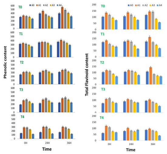 Phenolic (µg GAE) and total flavonoid contents (µg QE) in sprouts of V. radiata under salt stress in the presence of A. nodosum Extract (ANE). (A0–A4 are ANE concentrations 0.00, 0.01, 0.05, 0.10, and 0.50% and T0–T4 are NaCl concentrations 0, 25, 50, 75 and 100 mM, respectively). Bar indicates mean ± SD (n = 3).
