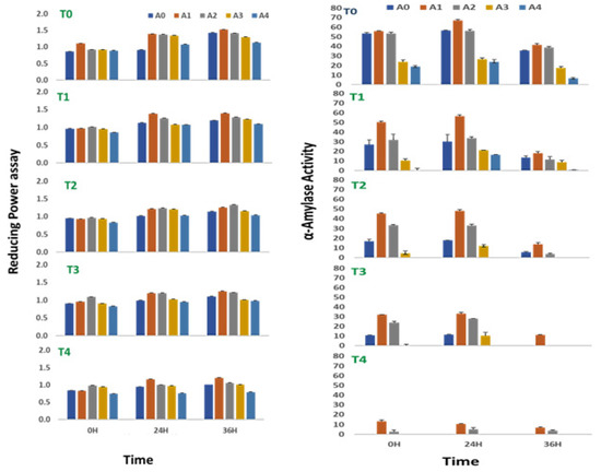 Reducing power assay and alpha amylase activity of sprouts of V. radiata under salt stress in the presence of A. nodosum Extract (ANE). (A0–A4 are ANE concentrations 0.00, 0.01, 0.05, 0.10, and 0.50% and T0–T4 are NaCl concentrations 0, 25, 50, 75, and 100 mM, respectively). Bar indicates mean ± SD (n = 3).