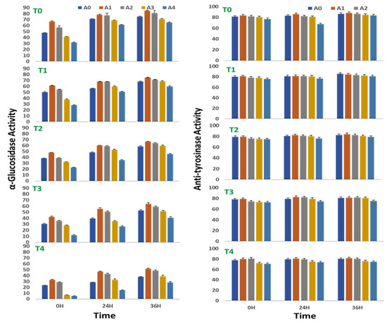 Alpha-glucosidase and tyrosinase inhibition of sprouts of V. radiata under salt stress in the presence of A. nodosum extract (ANE). (A0–A4 are ANE concentrations 0.00, 0.01, 0.05, 0.10, and 0.50% and T0–T4 are NaCl concentrations 0, 25, 50, 75 and 100 Mm, respectively). Bar indicates mean ± SD (n = 3).
