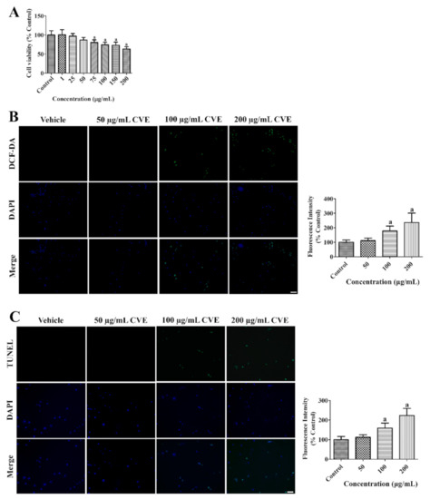 The toxicity of CVE was assessed to determine the optimal concentration to prevent death in HT22 cells by 2′,7′-dichlorofluorescein (DCF) fluorescence, terminal deoxynucleotidyl transferase dUTP nick end labeling (TUNEL) staining, and WST-1 assays. Incubation with CVE for 60 min showed no or less DCF and TUNEL fluorescence as well as cell death in HT22 cells at a concentration of 50 μg/mL. However, cell viability was significantly decreased concentration-dependently and about 63.3% of cells were found after incubation with 200 μg/mL CVE (Figure 1A). Treatment with 100–200 μg/mL CVE significantly increased DCF and TUNEL fluorescence concentration-dependently in HT22 cells by 236.0% and 223.3% of control group, respectively (Figure 1B,C).