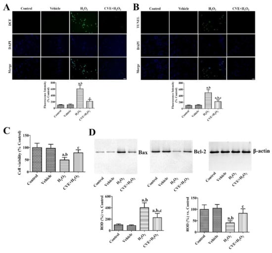 Bax and Bcl-2 protein levels were similar between the control and vehicle-treated groups. However, in the H2O2-treated group, Bax protein levels were dramatically increased to 403.4% of the control group 6 h after H2O2 treatment, while Bcl-2 levels were significantly lower (40.6%) than the control group. In the CVE + H2O2 group, the changes in Bax and Bcl-2 levels were significantly reduced to 226.7% and 82.7% of the control group, respectively, compared to the H2O2-treated group (Figure 2D).