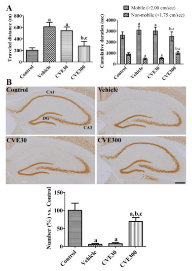 2.3. Effects of CVE on Motor Activity and Cell Death in the Hippocampus after Ischemia