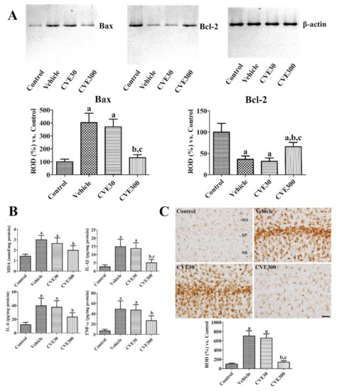 Cissus verticillata extract (CVE) ameliorates ischemia-induced apoptosis/anti-apoptosis, lipid peroxidation, pro-inflammatory cytokine releases, and microglial activation. (A) Three days after ischemia, apoptosis and anti-apoptosis were analyzed in the hippocampus using western blot for Bax and Bcl-2. (B) Six hours after ischemia, lipid peroxidation and pro-inflammatory cytokines were analyzed based on ELISA assay for MDA, IL-1β, IL-6, and TNF-α in the gerbil hippocampus of control, vehicle, CVE30, and CVE300 groups (n = 5 per group). (C) Four days after ischemia, the hippocampi were immunostained with Iba-1 antibody to detect microglia in the hippocampal CA1 region. SO, stratum oriens; SP, stratum pyramidale; SR, stratum radiatum. Scale bar = 50 μm. Optical density was analyzed and relative optical density (ROD) was represented as percentile values of control group (n = 5 per group). (A–C) Data are presented as mean value ± standard deviation and were analyzed using one-way ANOVA followed by Bonferroni’s post hoc test (a p < 0.05, significantly different from the control group; b p < 0.05, significantly different from the vehicle group; c p < 0.05, significantly different from the CVE30 group).