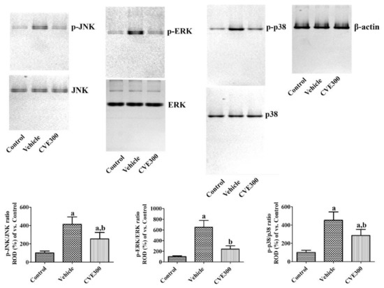 Cissus verticillata extract (CVE) ameliorates ischemia-induced phosphorylation of MAPKs. One day after ischemia, phosphorylation of MAPKs was assessed in the hippocampus of control, vehicle, and CVE300 groups by western blot for p-JNK, JNK, p-ERK, ERK, p-p38, and p38. Data are presented as mean value ± standard deviation and were analyzed using one-way ANOVA followed by Bonferroni’s post hoc test (a p < 0.05, significantly different from the control group; b p < 0.05, significantly different from the vehicle group).