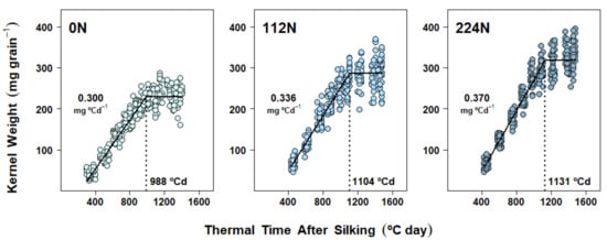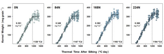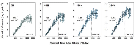 Final KNC was also strongly affected by soil N supply (Table 1, Table 2 and Table 3), thus mirroring both KW and GY responses. Given the importance of this physiological parameter, abundant research has been done around the sources of KNC [,,,,]. However, the dynamics of N accumulation on a per-kernel basis (i.e., KNAD and KNAR) have been less frequently considered in field experiments. Moreover, from the few cases where KNC was determined periodically during the grain-filling period [,,], only one study had formally modeled these data as a function of days after silking []. Therefore, to the best of our knowledge, our study represented the first effort to describe KNC over the grain-filling period by estimating KNAD and KNAR characterization parameters on a thermal-time basis.