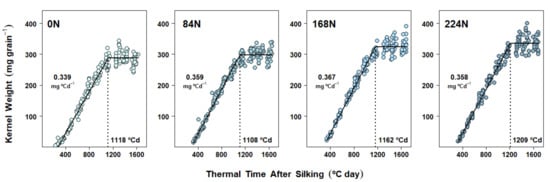 Individual KW is a genetically determined trait [], and it varies among genotypes via different combinations of EGFR and GFD [,]. However, environmental conditions during the linear phase, such as extreme temperatures [] or water stress [], also change final KW. Furthermore, at the crop level, decreases in KW under low N conditions have been associated with reductions in post-silking biomass accumulation (i.e., photosynthetic source capacity) and with changes in source–sink ratio [,]. On a per-kernel basis, DM dynamics have been described for numerous experimental conditions, but few studies have investigated how kernel growth parameters (i.e., GFD and EGFR) might be affected by contrasting N availability scenarios. For example, KW changes under different N supply have been related to changes in grain-filling rate [] or changes in both the EGFR and the GFD [,]. However, because maize response to N is often a function of N timing and plant density, further research into the physiological determinants of final KW under a wide per-plant and per-kernel N availability gradient could help identify underlying mechanisms and management combinations for achieving higher KW.