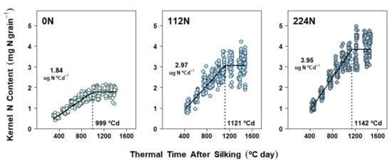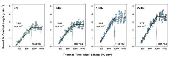 While carbohydrates dominate the DM accumulated by kernels during grain filling, N assimilates are also actively demanded by these sink tissues []. N allocated to the kernels comes from post-silking N uptake and/or N remobilization from leaves and stems [,], and it is used for the synthesis of both storage proteins and enzymes required to convert soluble sugars and amino acids into starch and proteins, respectively [,]. Despite its crucial role in achieving final KW, kernel N accumulation over time has not been studied in the same detail as DM. Recent studies have looked into kernel N accumulation from a descriptive perspective by plotting linear interpolations between five [] or seven [] consecutive sampling dates over the grain-filling period. While both of these studies provided valuable insight into kernel N dynamics, the N availability ranges were limited to 2–3 N rates (without a secondary factor), and the lack of kernel samplings beyond 50–58 days after silking (DAS) prevented a deeper analysis of possible peaks or plateaus that may further explain the relationship of final KW with final kernel N content. Furthermore, the dependency of kernel biomass versus N accumulation patterns on whole-plant N sufficiency (as quantified in the nitrogen nutrition index - NNI) [] before and at the beginning of linear fill is also unknown. Given the tight interactions between C and N source–sink dynamics [,], describing kernel N accumulation via well-known characterization parameters should help in better understanding physiological mechanisms associated with DM accumulation, and ultimately final KW.