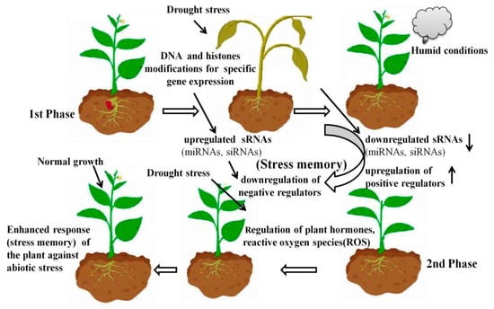 Plant memory, specifically, “stress memory”, is an important trait that involves some specific mechanisms such as stable DNA methylation, which leads to an improved stress tolerance response in plants that have previously undergone acclimation and hardiness to the same stress driver [7]. These memories are due to epigenetic changes and play an important role by enabling plants to perform better against similar environmental hazards in the future [8]. It has been found that plants not only adopt changes for the prevailing stress scenario but also remember this information for the next generations to efficiently cope with such environmental conditions [6,9]. Epigenetic modifications provide heritable changes in the activities of genes and play an important role in gene expression to cope with environmental stresses through small RNA, expression of miRNA or siRNA for post-transcriptional gene silencing, DNA methylation, and histone changes [10,11,12,13,14,15]. The enzymes responsible for epigenetic changes are not involved directly; however, proteins as transcriptional factors and others play a mediatory role in the function of the enzymes in gene regulation to achieve the target [16]. Sometimes, the temporary arrangements to cope with the stressed environment are not stable, and as soon as the stress is over, plants behave like normal, while many research findings have shown that some modifications due to environmental stress are stable, remembered by plants, and carried over to the next generations as a stress memory [10,15,17,18]. As shown in Figure 1, a plant under drought stress during its first exposure remembers it as a stress memory and behaves normally or more efficiently at a later growth stage when facing a similar stress [15,19,20,21].