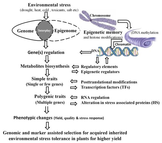 Crop breeding for improvement in agronomic characteristics has always been linked with germplasm diversity. The variable desired traits are harbored through artificial means through crossing and selection for genetic improvement; however, the declining diversity has made it necessary to find new ways to ensure food security on a sustainable basis [13]. Breeding, marker-assisted selection, and development of genetically modified organisms/plants through biotechnology are the main ongoing research focus for crop improvement for multiple traits. Presently, epigenetics is arising as an alternative potential research approach because variants produced through epigenetic changes may be a good source for breeding and selection of crops and especially for clonal propagules [13,14]. Based on traditional breeding principles, selecting epigenetic phenotypes can be useful for breeding towards stress-tolerant plants at different levels (metabolites, simple traits, and polygenic). In this selection process, regulatory and epigenetic factors play an important role in gene expression and multi-trait development for the yield and quality of the genotypes [40,159] (Figure 2). In many recent studies, it has been found that plants have the ability to memorize past events, which can help scientists breed crops more precisely to face environmental stresses more successfully [169].