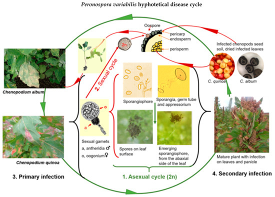 Proposed disease cycle of quinoa downy mildew caused by Peronospora variabilis (Photos: C. Colque-Little). Picture of haploid gamets adapted from Judelson [58].