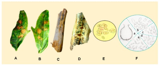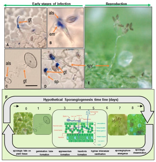Stomata colonization happens relatively quickly. Once an appressorium is established, the secretion of extracellular matrices during the germination of the sporangia appears, as reported elsewhere (Figure 3B) [59]. The hyphae ramify intercellularly, forming haustoria (feeding structures) through the leaf tissue five to six days after penetration (Figure 3A–F). The sporangiophores emerge from the leaf’s surface around the seventh day, carrying asexual lemon-shaped sporangia (Figure 3E,F). Seven to ten days after the primary infection, sporangia are disseminated to other leaves by wind and water [40,59] (Figure 3F). They are assumed to be of importance for spreading the disease during the growing season at this stage [62]. In general, Peronospora species require moderate temperatures (10 °C–20 °C) for optimal sporulation [63,64]. While the disease is developing, several asexual cycles (reproduction of sporangia) may occur. Secondary infection demonstrated that the disease could spread rapidly in the field if the optimal conditions are present [54].