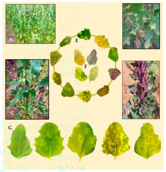 (A) Quinoa crop severely damaged by downy mildew. (B–D). Infected varieties in the fields of the main quinoa growing areas of Bolivia. (E) Adaxial leaf side belonging to different quinoa genotypes artificially infected with downy mildew. (F) Abaxial side of the leaves showing sporulation. (G) Differences in disease symptoms, ranging from hypersensitive reactions causing pale yellowish spots (left) to high susceptibility with chlorotic lesions covering the whole leaf (right) (Photos: C. Colque-Little).