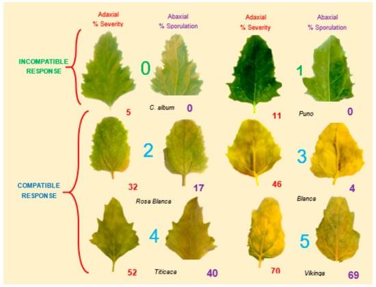 Set of reference cultivars postulated for profiling the virulence of Peronospora variabilis, including C. album and two Bolivian cultivars with intermediate reactions. Leaves from three-week-old artificially inoculated plants. Numbers in red indicate the percentage of severity on the adaxial side, and those in purple indicate the percentage of sporulation on the abaxial side [52]. Numbers in green (incompatible response) and blue (compatible response) correspond to Ochoa’s scale: 0 = no symptoms; 1 = 2−5-mm lesion with truncated mycelium in the mesophyll of the leaf; 2 = 4−8-mm chlorotic lesions with minor sporulation; 3 = medium-sized and confined chlorotic lesions with sporulation mainly on the abaxial side of the leaf; 4 = large, not clearly confined chlorotic lesions with sporulation mainly on the abaxial side of the leaf; 5 = mild chlorosis with abundant sporulation on both adaxial and abaxial sides of the leaf (Ochoa et al., 1999 [40], Colque-Little et al., 2021 [52]). Both assessments are comparable in terms of severity and sporulation; thus, the existence of resistance factors is hypothesized in this set of reference cultivars.